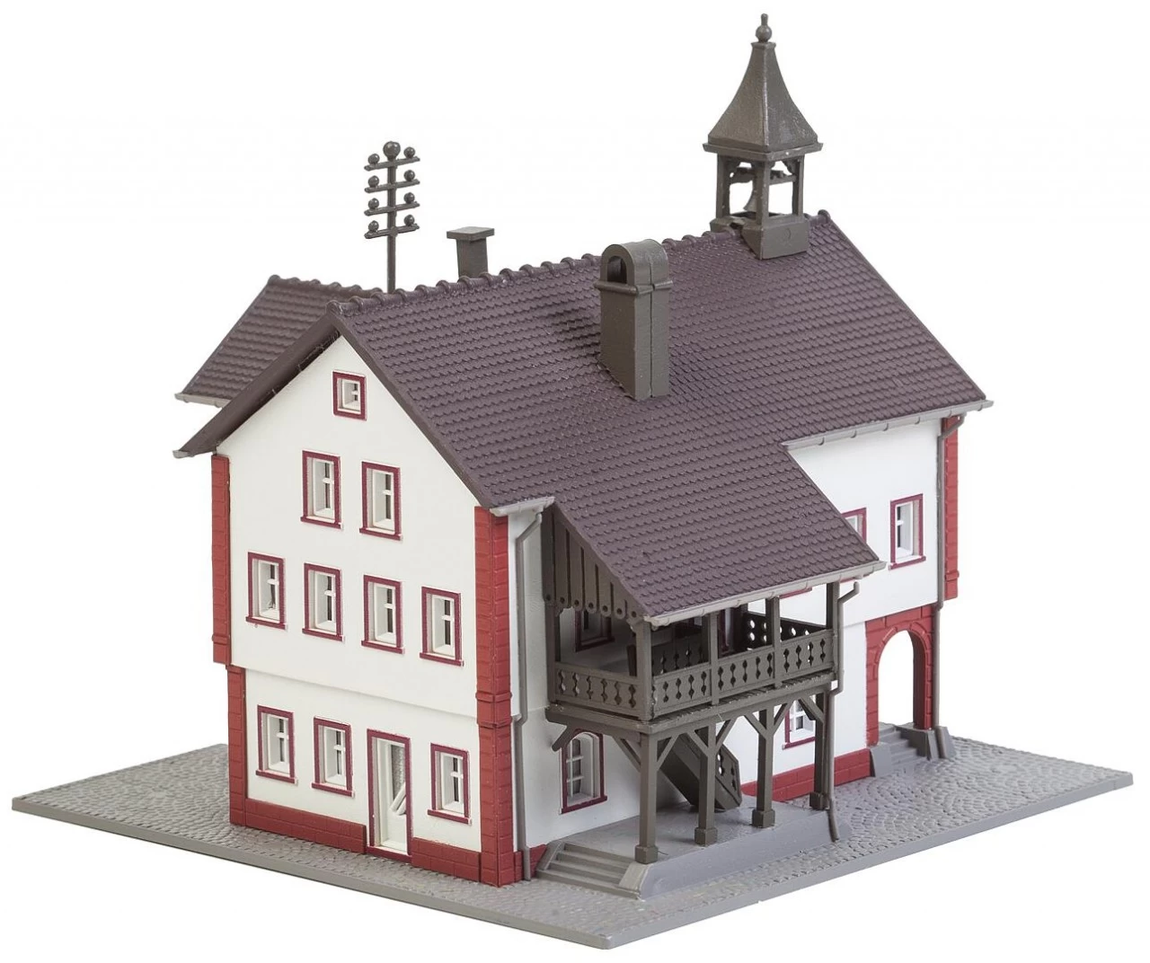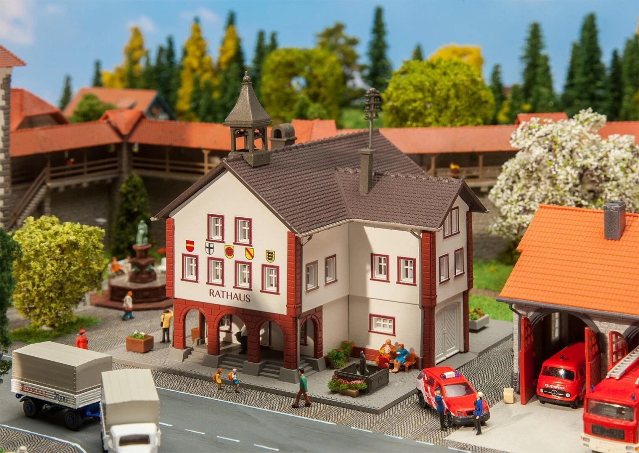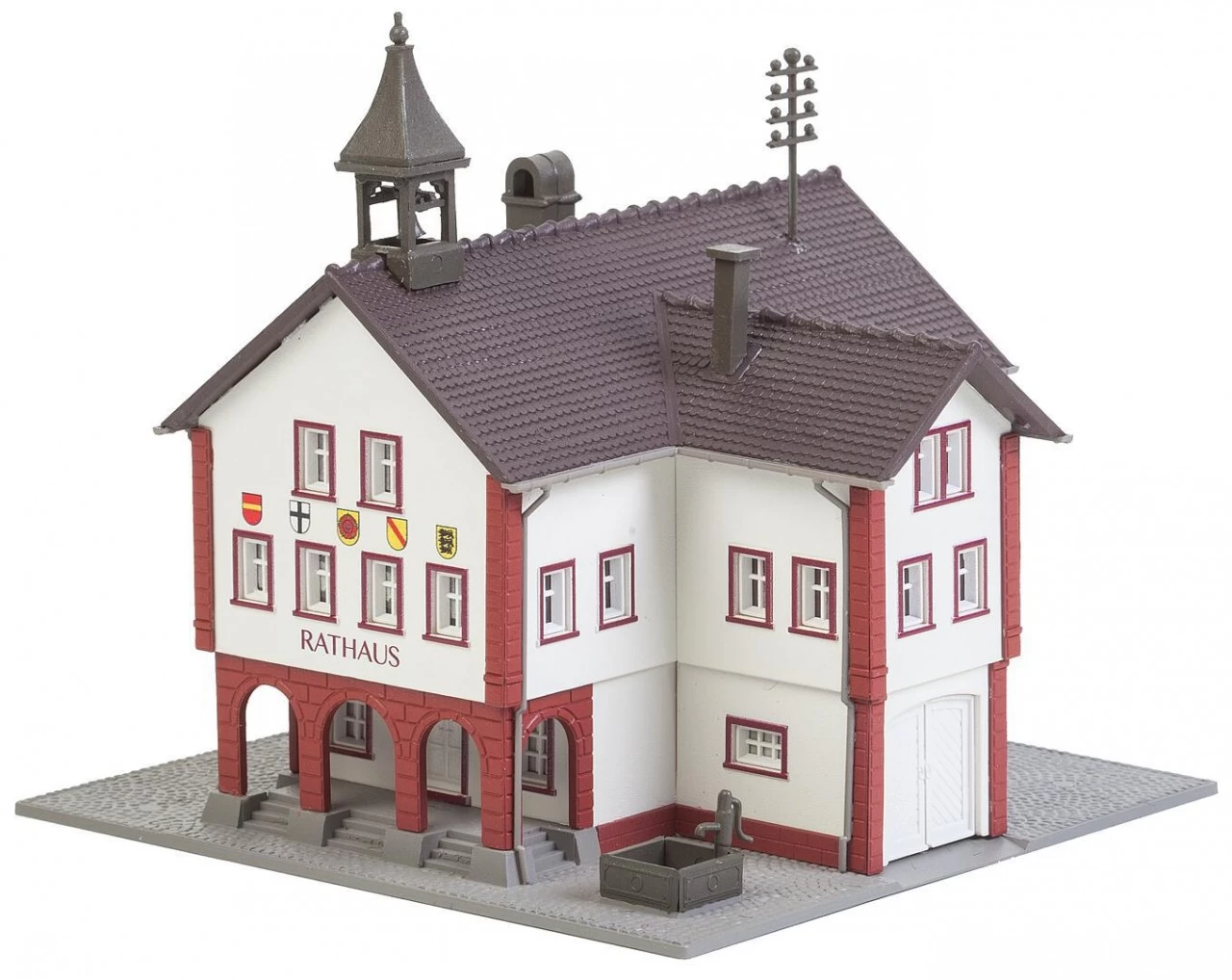Dreigeschossiges Kleinstadtrathaus mit drittem Giebel, Arkadengang und seitlichem Balkon mit Treppenzugang unter einem Schleppdach. Bodenplatte, Glockenturm und ein Brunnen gehören zum Bausatzumfang des Modells mit digital bedruckter Giebelwand.