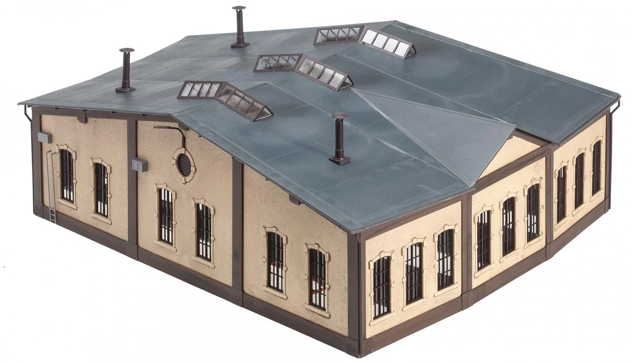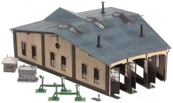 Dreiständiger, erweiterbarer Lokschuppen in 7,5 Grad Teilung mit Dachreitern und großen Seiten- und Rückfenstern für die Lokomotiven bis 290 mm LüP Ihrer Sammlung. Servo-Antriebsteile für alle Tore sowie zahlreiches Zubehör, wie Spindelhebeböcke, Lokführerwartehaus und Transformatorenstation sind im Bausatz enthalten.