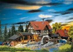 Sägemühle aus dem Schwarzwald. Das Wasserrad wird durch den beigefügten Motor (12-16 V, Wechselspannung) angetrieben, der gleichzeitig auch das sichtbare Sägegatter hörbar auf- und abbewegt. Die offene Bauart erlaubt Einblicke in den Sägereibetrieb. Ein Bretter- und Holzsortiment liegt bei. Das Holzlager kann durch Zukauf der Artikel 180589 und 130288 umfangreich ausgebaut werden.