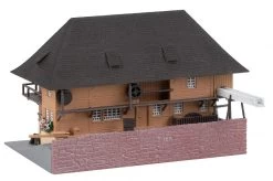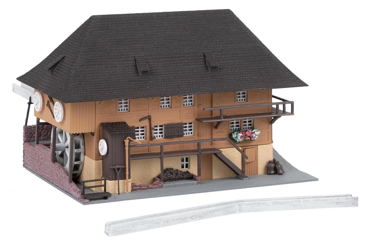 Schwarzwälder Wassermühle mit Wohnteil unter einem mit Schindeln gedeckten Walmdach. Ausschmückungsteile für die Fassaden- und Außengestaltung, wie ein Hochgerinne, Blumenkästen, Außenklo, Wagenräder, Holzscheit und Säcke beiliegend. Das Wasserrad kann mit dem separat erhältlichen »Synchron-Bastelmotor«, Art. 180629 angetrieben werden.