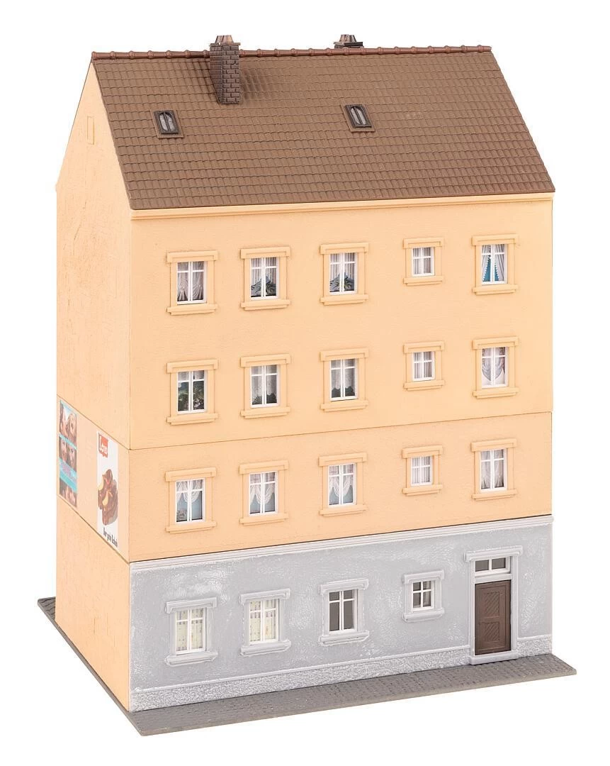 4-stöckiges Reihenstadthaus mit einem Schuhladen im Erdgeschoss.