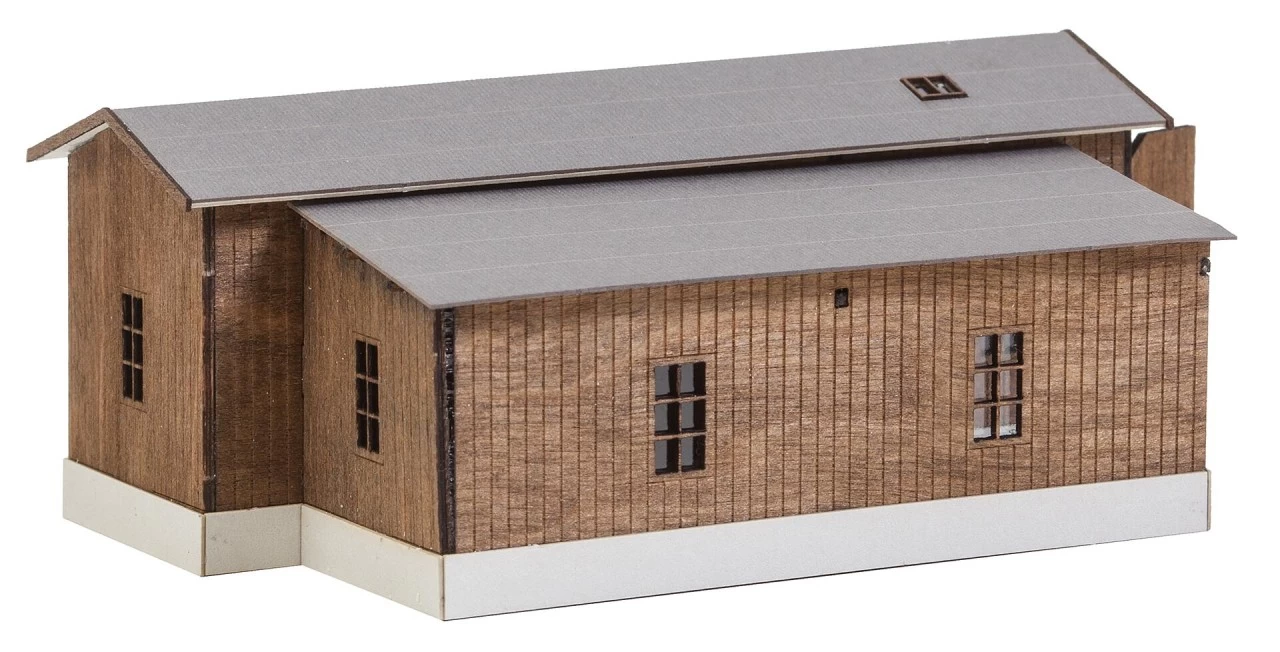 Lasercut-Modell einer Triebwagenremise mit seitlichem Anbau nach einem Originalvorbild im Schwarzwald. Die überdachte Abstellfläche der Holzkonstruktion kann bspw. als Omnibus-Unterstand oder für Events, wie Remisenfrühschoppen genutzt werden.