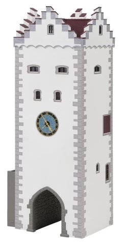 Mittelalterlicher Uhrenturm auf quadratischem Grundriss, mit groĂźer Torbogen-Durchfahrt, seitlicher Treppe, markanten Ecksteinen und vier Treppengiebeln. Als Vorbild fĂĽr den Bausatz diente der Siegelturm in Diessenhofen im Schweizer Kanton Thurgau. Alle vier Seiten des Modells sind digital bedruckt.