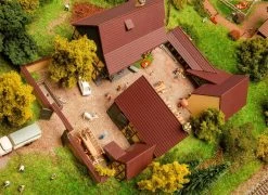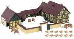 GebĂ€ude-Set mit Fachwerkfassaden! Hofanlage bestehend aus einem WohngebĂ€ude, einer Scheune mit Anbau, StĂ€llen fĂŒr Kleintiere und einer Ummauerung. Die GebĂ€ude lassen sich variabel anordnen. FĂŒr die AusschmĂŒckung liegen dem Set Zubehörteile, wie Mistwagen, HundehĂŒtte, Lattenzaun, Storchennest bei.
