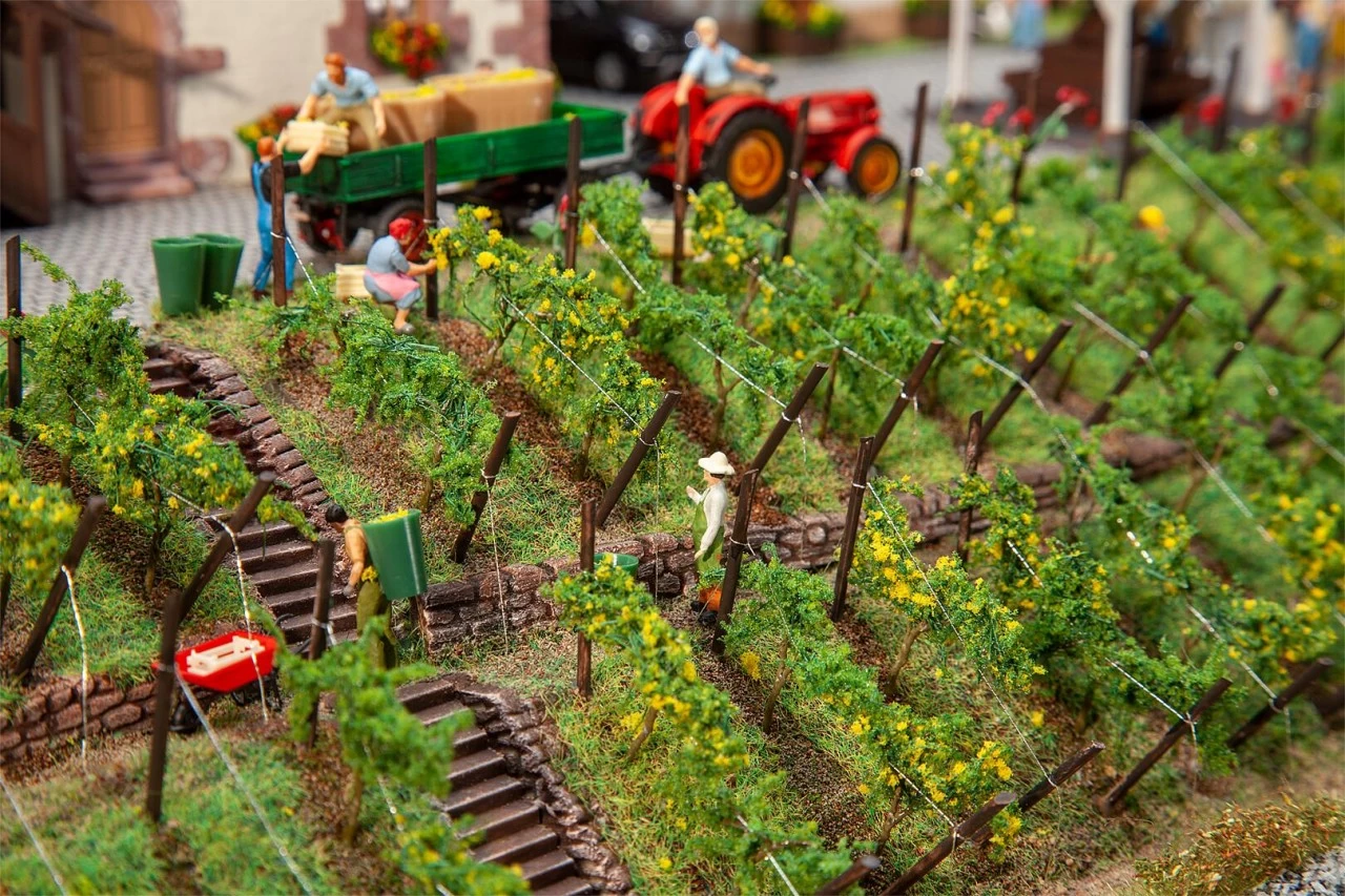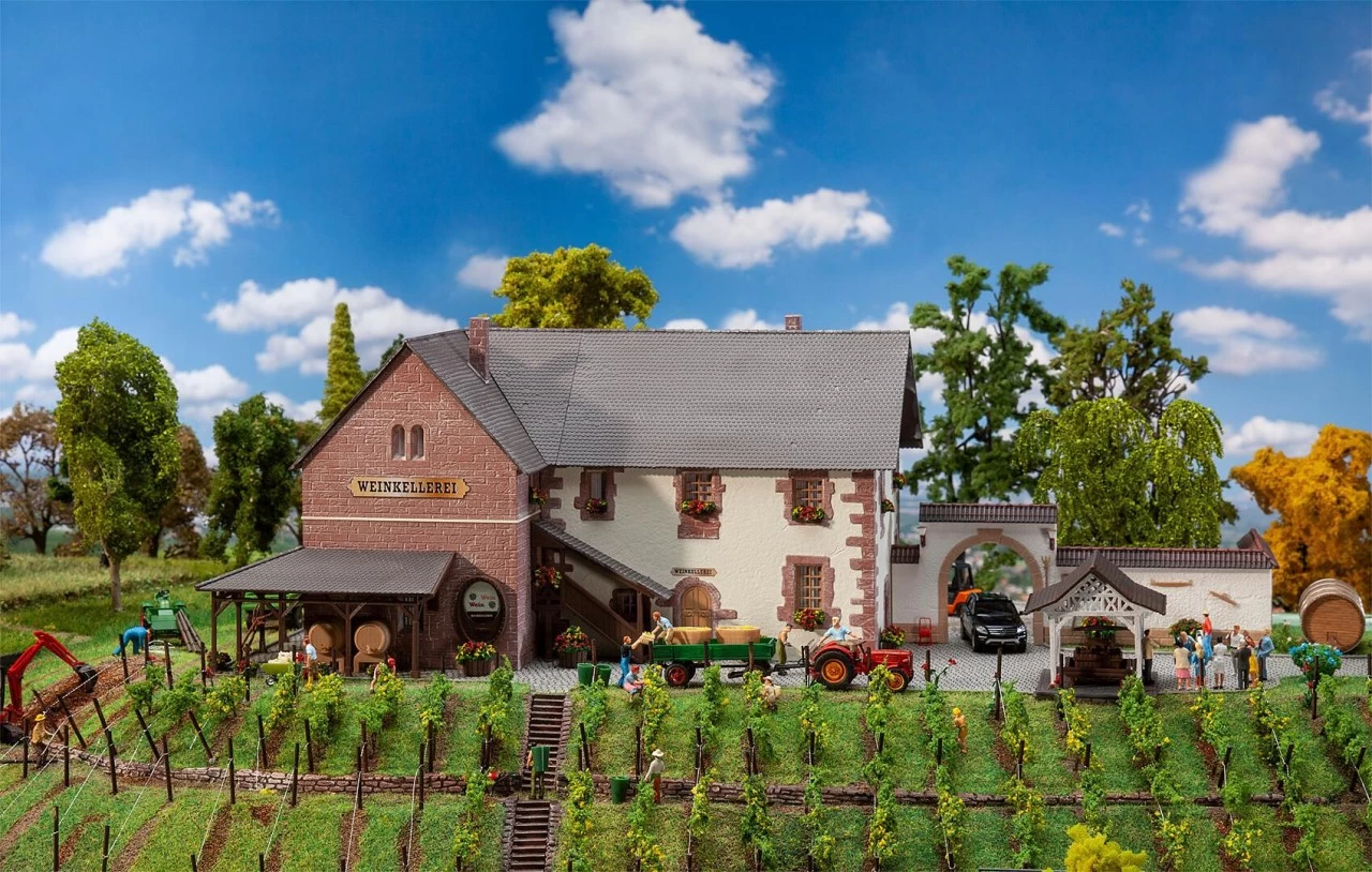 Weingenuss! Patiniertes Modell einer Weinkellerei bestehend aus zwei in L-Form verschränkten, zweigeschossigen Gebäuden mit Außentreppe und überdachtem Außenbereich. Ecksteine, Fenster- und Türgewände der verputzten Gebäudehälfte sind steinsichtig. Als Ausgestaltungselemente liegen Weinfässer, Bottiche und Blumenkübel bei.